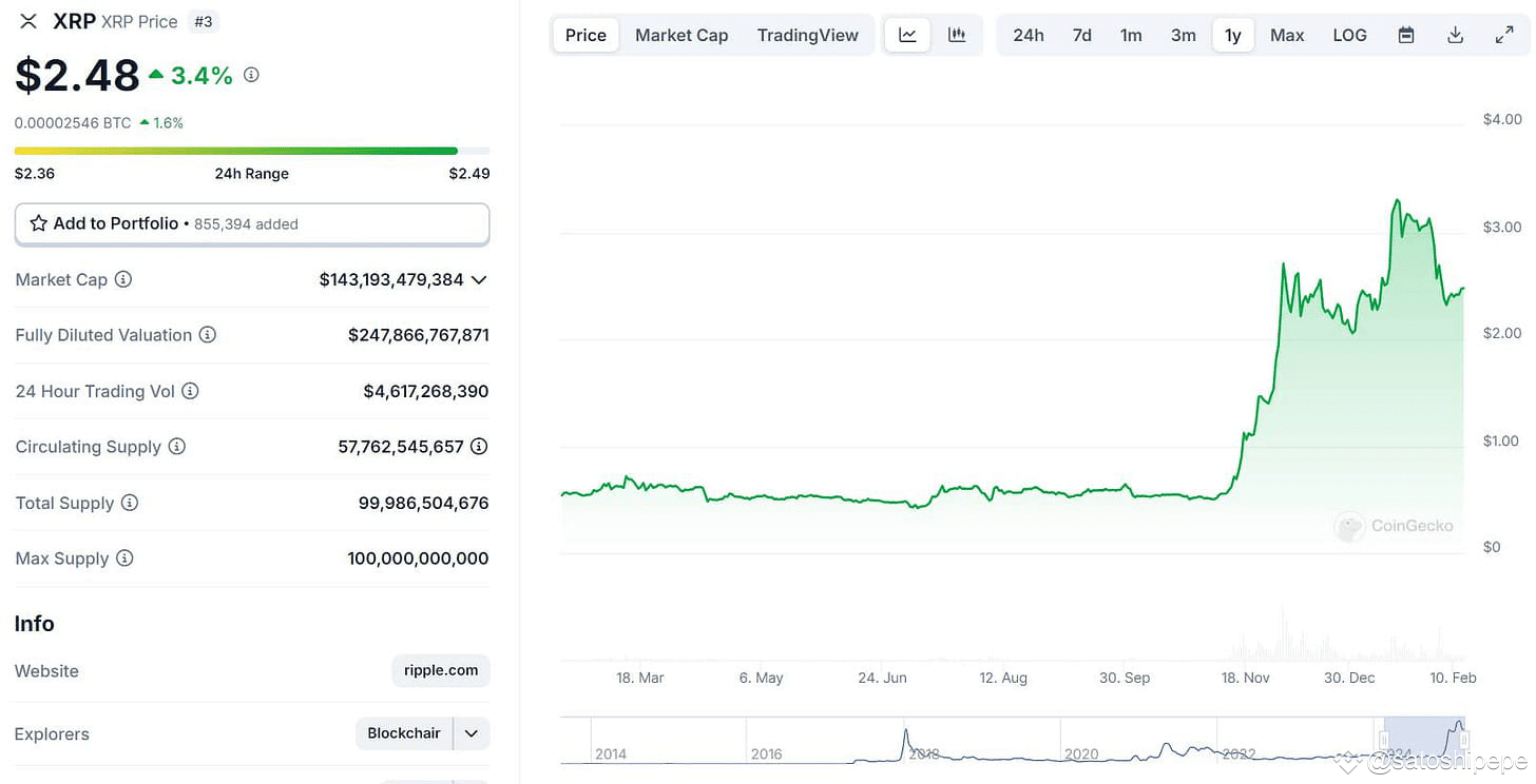 Biến động giá XRP trong 1 năm qua. Nguồn: CoinGecko (13/02/2025)