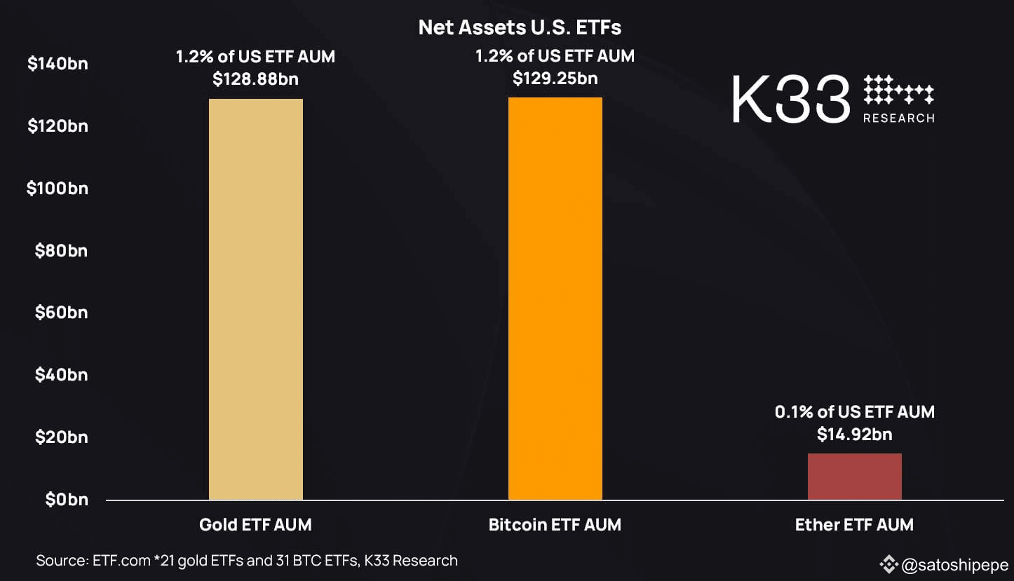 Giá trị tài sản nắm giữ bởi các quỹ ETF vàng so với các quỹ ETF Bitcoin. Nguồn: K33 Research