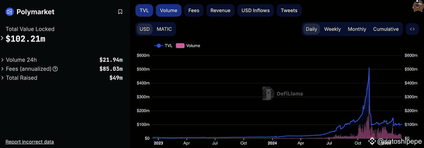 TVL và khối lượng giao dịch của Polymarket. Nguồn DefiLlama (18/02/2025)