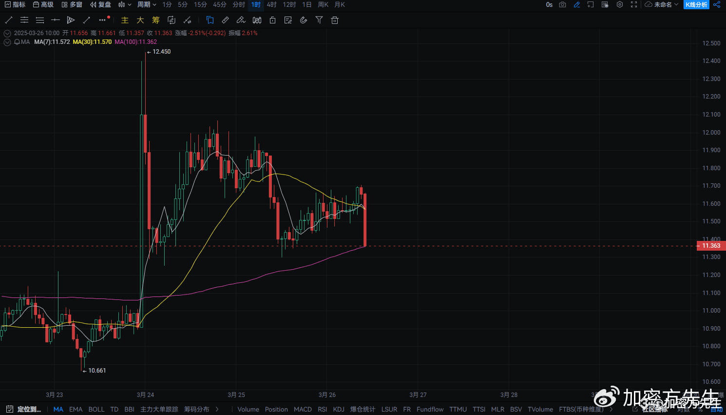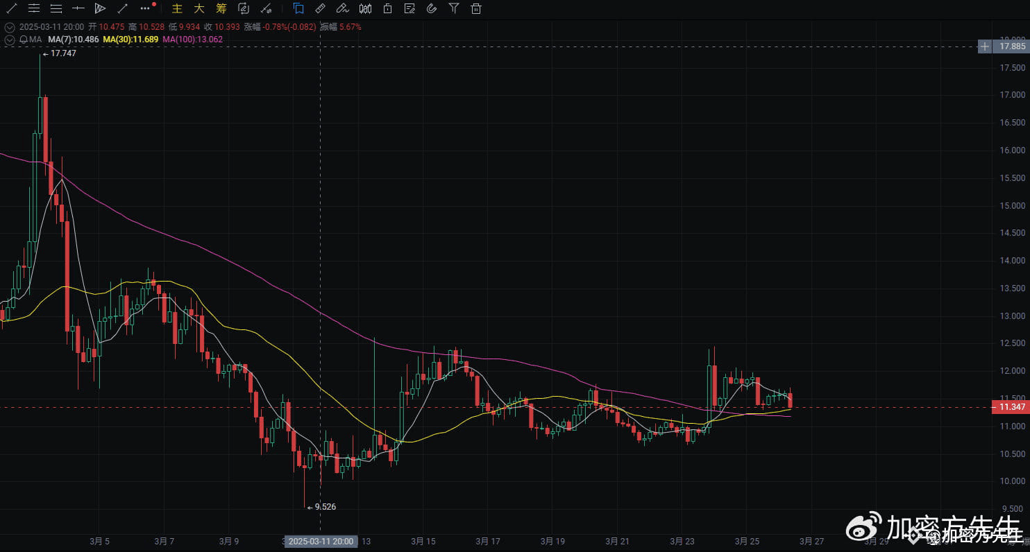 均线系统:MA7(11.57)和MA30(11.57)粘合,显示短期方向尚未完全明朗;MA100(11.36)作为关键支撑,若跌破将有更大下行空间。