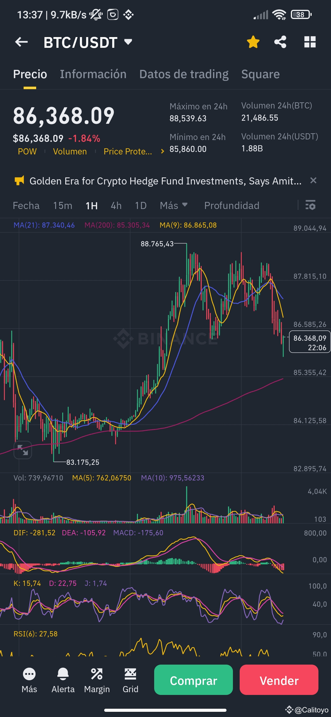 - Precio Actual: $86,368.09 (-1.84% en 24h).