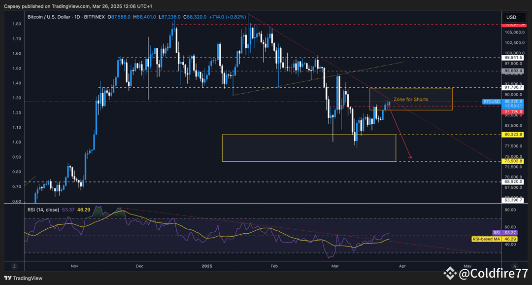 Cryptonary's take Whilst there's a tone going on here, and this makes our job figuring the market out more tricky, we do believe we have a handle on what's going on. The macro is still very uncertain, which has seen risk appetite decline, whilst we're not seeing any new liquidity stimulus from anywhere (in the US).Alongside this, we have an administration that's the cause of a lot of the uncertainty, and bar trying to get the US10Y Yield lower, we still don't know exactly what the Trump administration is trying to achieve. Add to this that April 2nd is more likely a mid-way point in the tariff talk, rather than the end, and it's likely the uncertainty can continue for longer. Therefore, our stance remains to sit on the sidelines until we see more clarity from the Trump administration. The 'hard' data weaken substantially, and the FED react, a new form of stimulus, a significant removal of the overall level of uncertainty. If price does pull back from around the levels we have highlighted in the above, then it may be the case that if the lows are retested or broken, we could be light buyers of that dip. The simple reason for this is that we're further along the 'uncertainty path' than we were 2 months ago. We're keeping a super close eye on everything, as always, and we'll be looking to pull the trigger on buys when we believe the time is right. For now, we don't think that's just yet.