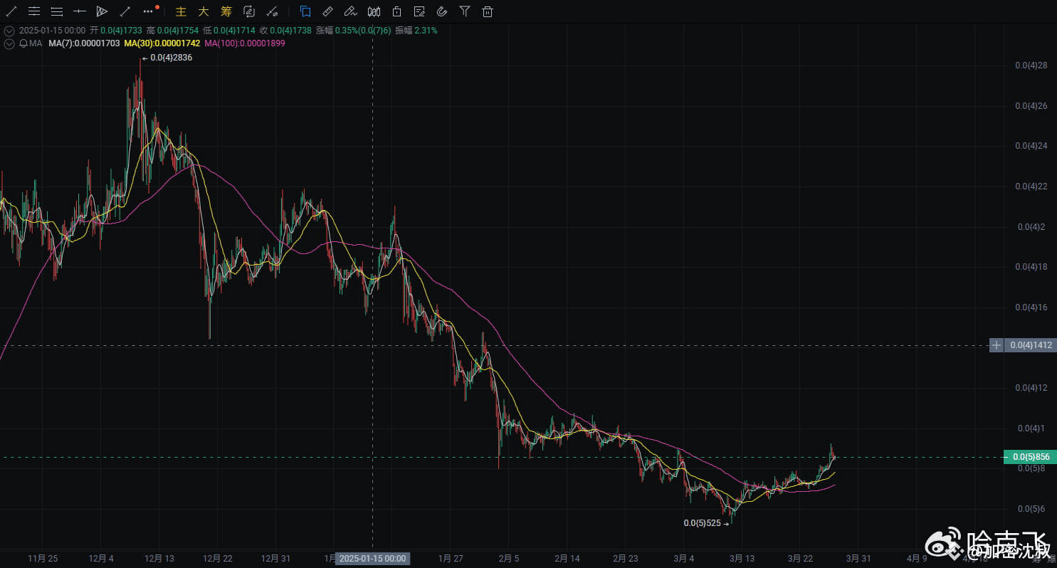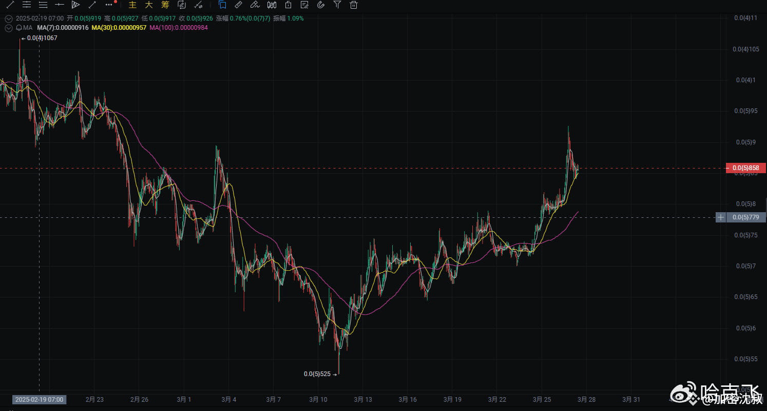 当前PEPE价格为0.0(5)859,昨日行情迎来强势上涨,突破多个关键阻力位。从K线形态来看,价格正处于明显的反弹趋势,短期内有望继续冲高,但需警惕回调风险。