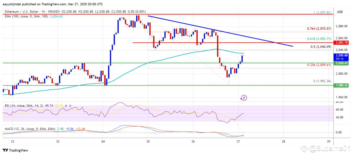 Ethereum recently experienced a correction, testing the $1,980 support level. However, it's showing signs of recovery and is now aiming for a move above the $2,050 resistance. Let's break it down: