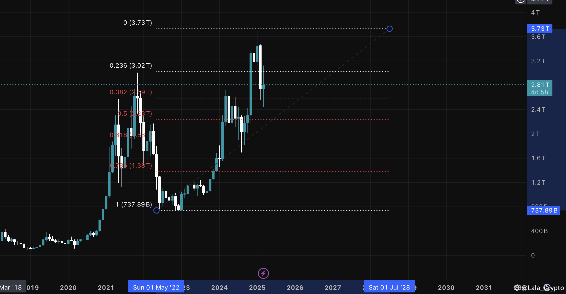 - Break + close above 1.0 and 1.13 → next stop: 3.6T to 4T (1.4 Fib)