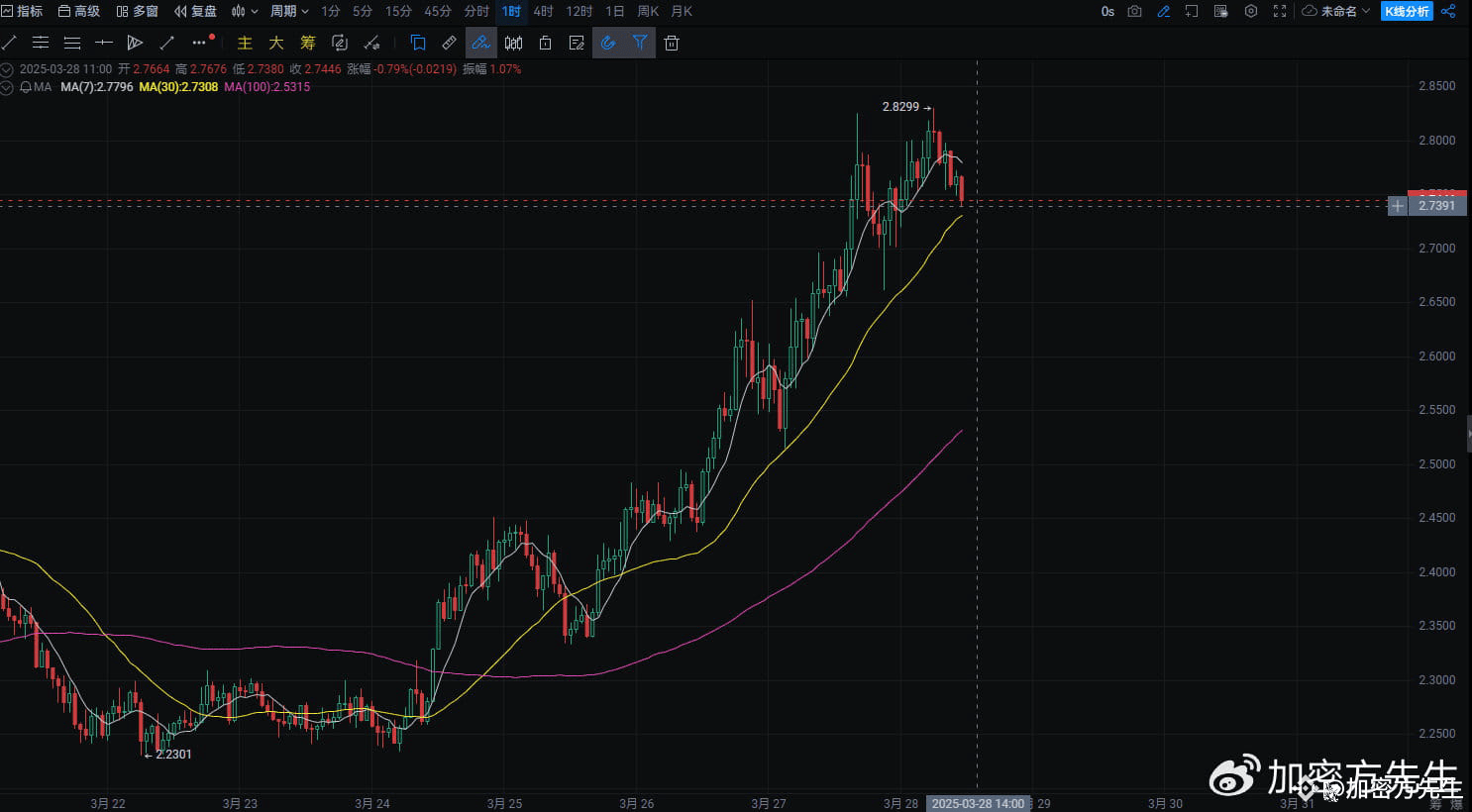 SUI近日走势强势突破,最高触及 2.92,目前回落至 2.75 附近。短期内多头情绪依旧占优,但已有资金流出迹象,市场或将迎来修正。本文将结合日线、四小时、一小时K线进行深度剖析,并制定精准的做空策略。