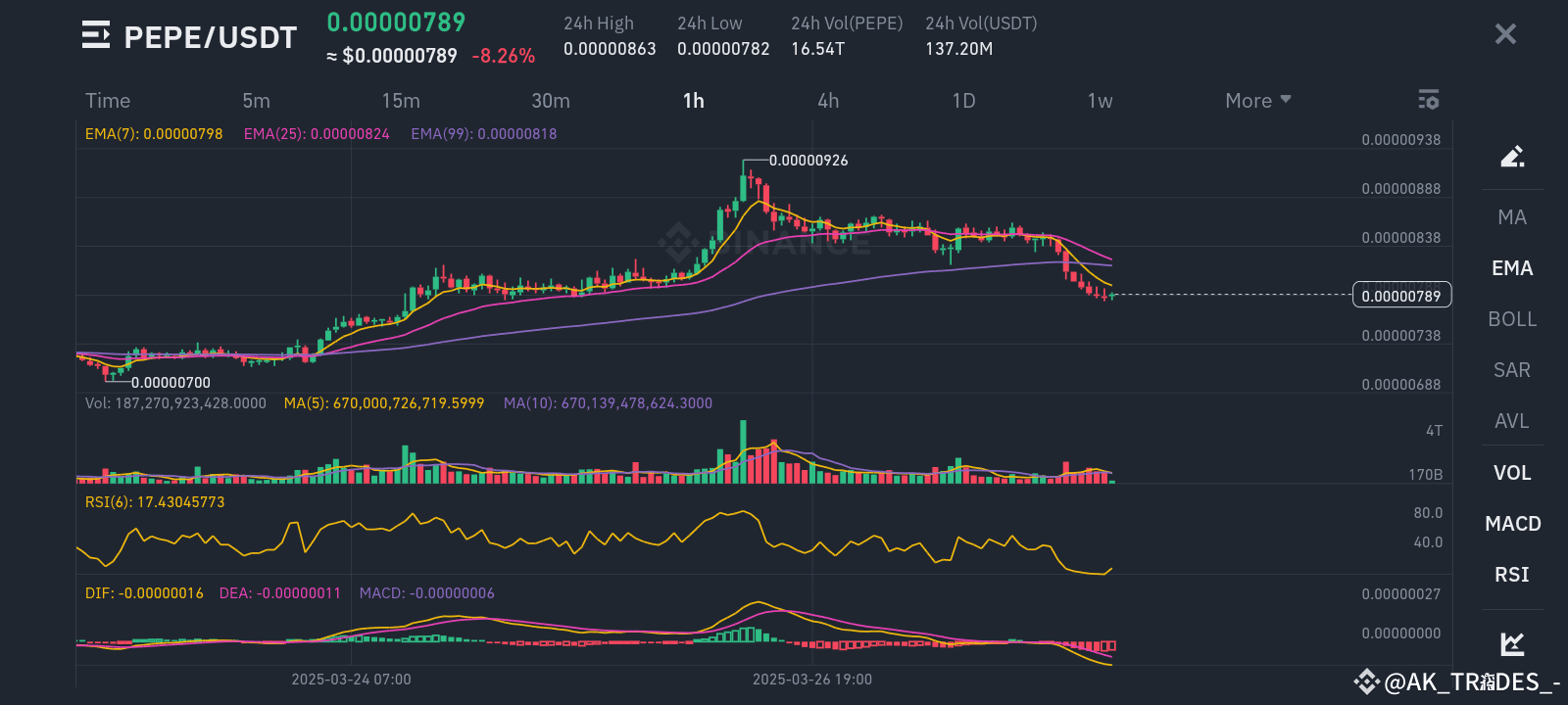 Current Price: 0.00000789 24h High: 0.00000863 24h Low: 0.00000782 RSI: 17.43 (Oversold) MACD: Strong Bearish
