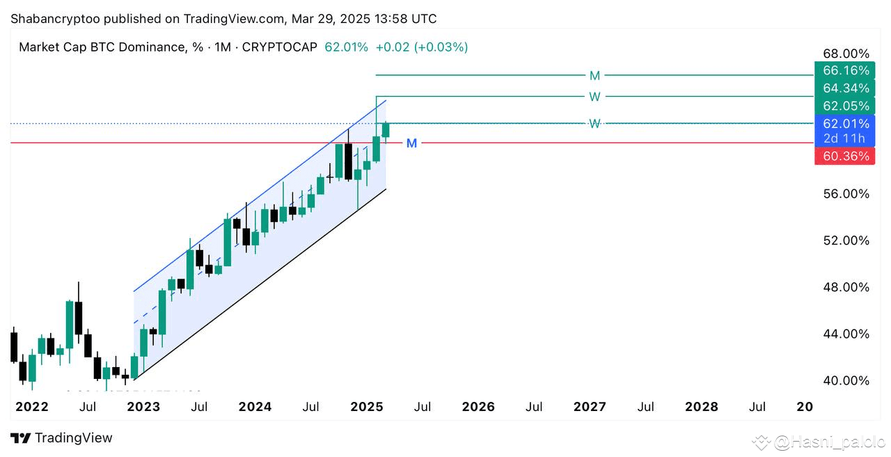 "Bitcoin's dominance continues to surge, exerting a profound impact on altcoins, which remain at their lows, with some experiencing a breakdown. This trend is driven by Bitcoin's dominance rising on the weekly chart, where it faces resistance at 62% and 64%, and on the monthly chart, where it faces resistance at 66%. A decline in dominance is likely to commence if we witness a monthly candle close below 60%, a critical pressure zone. Currently, investors face immense pressure, and the challenge is daunting. Ultimately, timing the market to catch the bottom or sell the top is extremely difficult."
