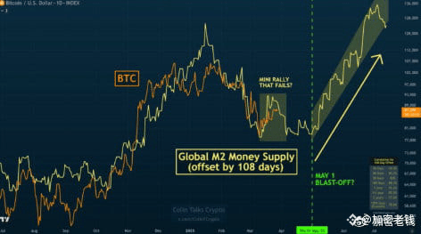 全球流动性尚未爆发,但 M2 供应量逐步抬升,历史上 M2 增长往往预示着比特币的新高。分析师 Colin Talks Crypto 甚至认为,比特币将在 5 月 1 日正式启动新一轮爆拉。