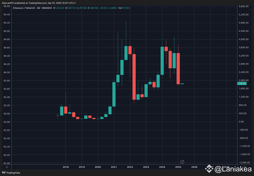 But when you zoom out to the quarterly chart, the Q1/2025 candle bears a strong resemblance to Q2/2021 — which preceded a massive rally. I lean toward the possibility that Ethereum could be setting up for a rebound in the coming quarters.