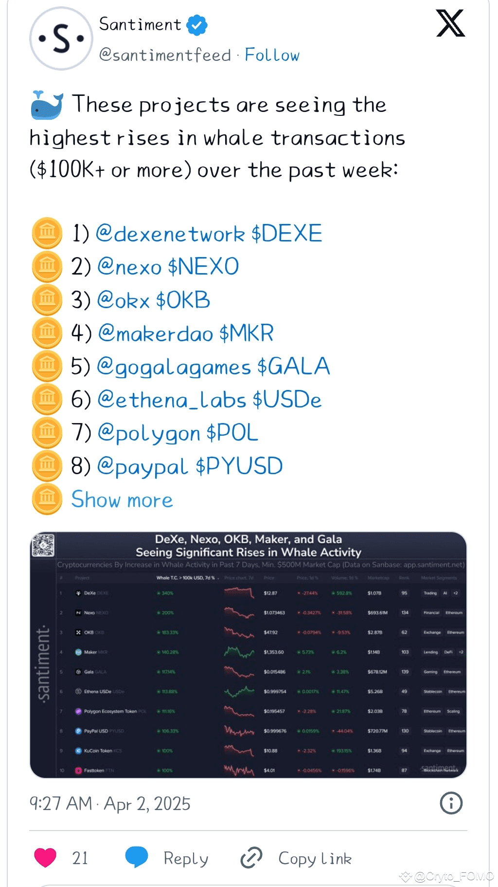 Santiment highlights DeXe Protocol (DEXE), NEXO, OKX (OKB), Ethena Lab’s USDe, Paypal (PYUSD), Kucoin (KCS) and Fasttoken (FTN) as other leading projects with over $100,000 in whale transactions.