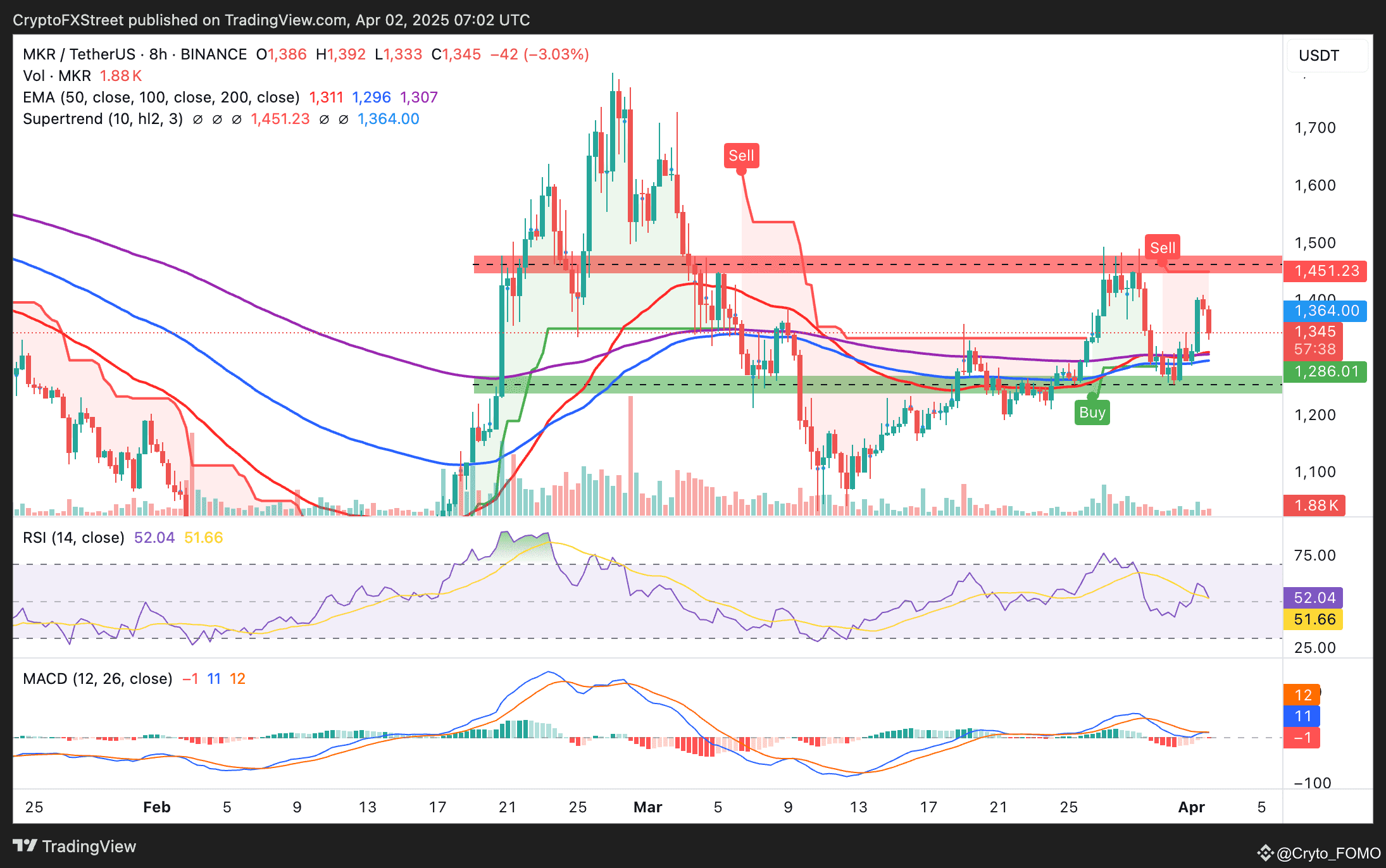 On the other hand, Maker could trade between the support band around $1,250 (green in the chart below) and the resistance band around $1,450 (red) until the tariff uncertainty clears to pave the way for the next major move.