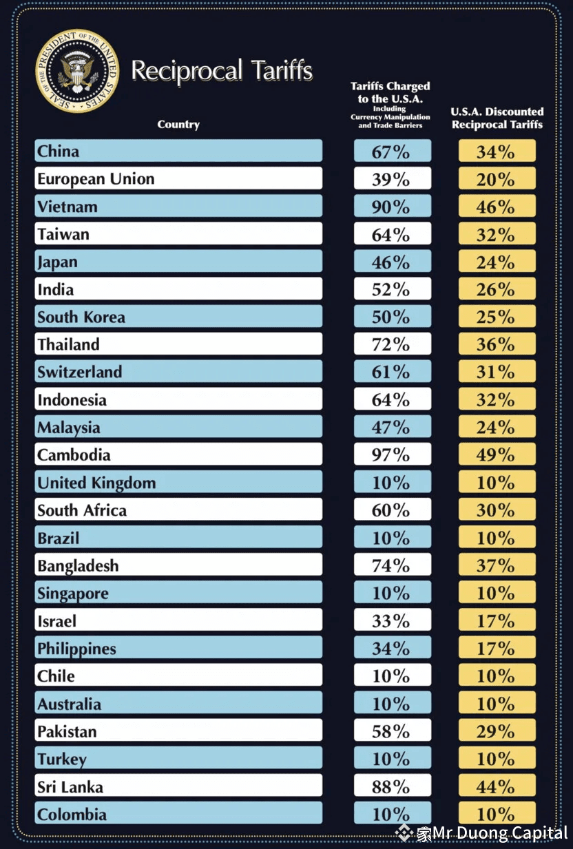 Cột bên cạnh hiển thị mức thuế quan mới của Hoa Kỳ đối với từng quốc gia, cũng như Liên minh Châu Âu.