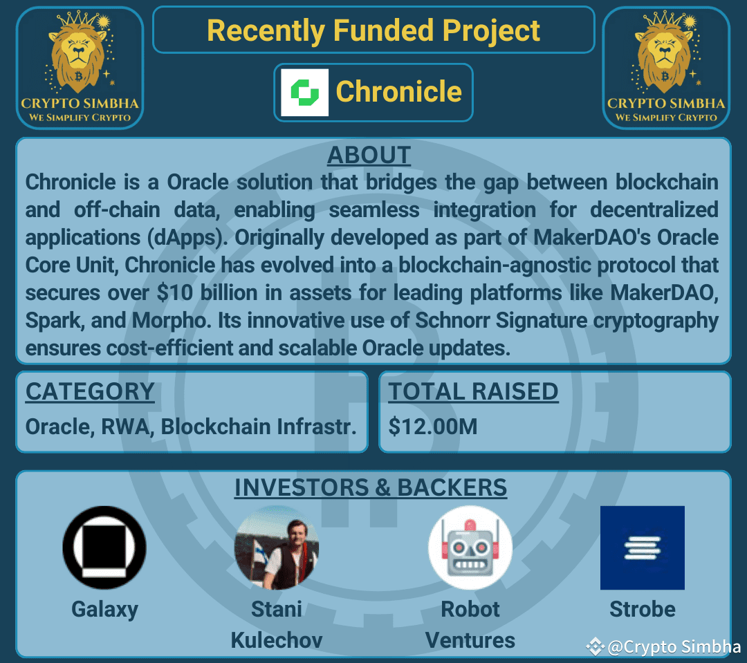 🔹About: Chronicle is a Oracle solution that bridges the gap between blockchain and off-chain data, enabling seamless integration for decentralized applications (dApps). Originally developed as part of MakerDAO's Oracle Core Unit, Chronicle has evolved into a blockchain-agnostic protocol that secures over $10 billion in assets for leading platforms like MakerDAO, Spark, and Morpho. Its innovative use of Schnorr Signature cryptography ensures cost-efficient and scalable Oracle updates, reducing gas fees while maintaining high security. Chronicle's decentralized validator network includes reputable entities such as Infura, Gitcoin, and Etherscan, enhancing trust and resilience. The protocol supports real-world asset tokenization and DeFi applications, offering verifiable data through its user-friendly dashboard.🚀🌐