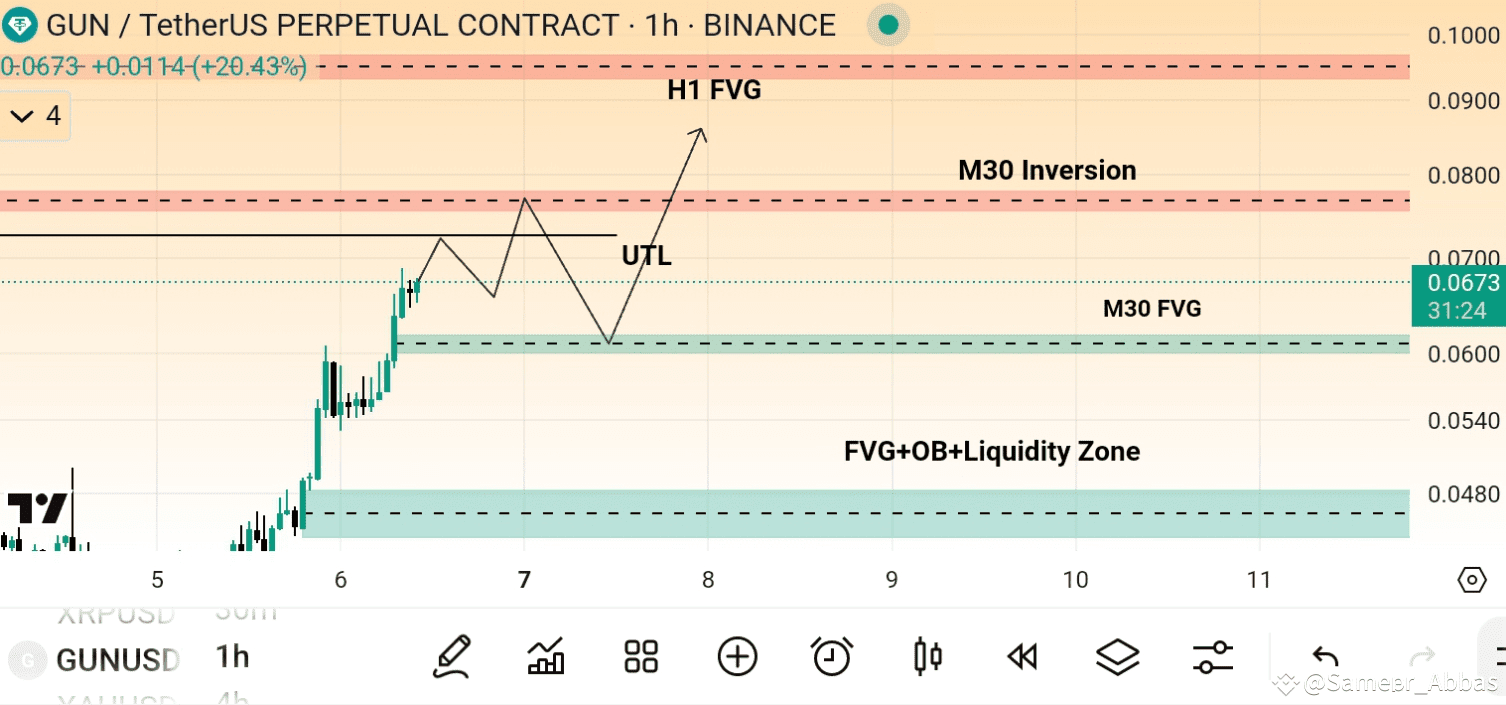 GUN can take a little retest from UTL level 2-5% and price will break it will go straight to its M30 inversion so that we can take a short from $0.0760 level but without confirmation I don't recommend for trade I always follow VSA confirmation. Ok so from inversion the price will drop Upto m30 FVG or liquidity Zone so we will buy Gun For LongTerm mean buy in spot. And the price will be bullish Bcs they breaking all his BOS.