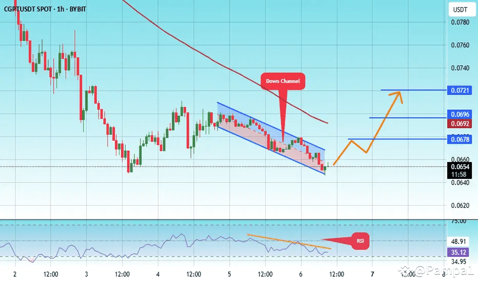 #CGPT is trading inside a descending channel on the 1-hour chart, respecting both the upper and lower bounds cleanly. A strong bounce has just occurred from the lower boundary support at $0.0650, showing signs of an upcoming breakout.