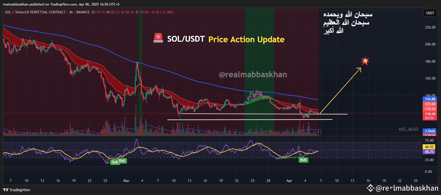 —Now here’s the thing: if SOL breaks and holds above $120, we might be looking at a clean move toward $130 in the short term. It’s a classic bounce setup, and volume’s slowly creeping in too. RSI is starting to tick up (not too overbought), and those little wicks near support suggest buyers are defending hard 🛡️.