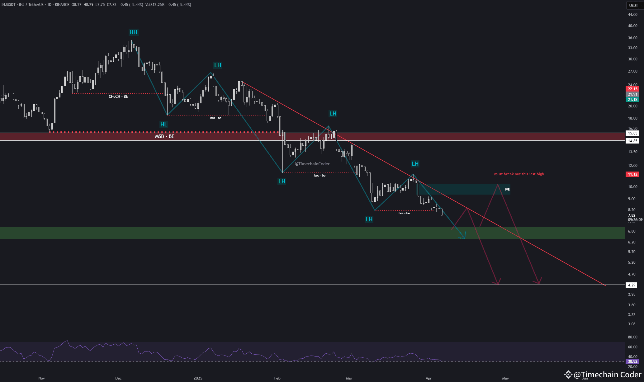 You can draw and follow the LH and LL along with the market structure as I did in INJ. I only marked the last LH and LL and put this range in a dark gray box. Since there has not been a close below the level I marked with the dashed green line yet, it has not made a new bearish BOS (break of structure), but the downtrend continues.