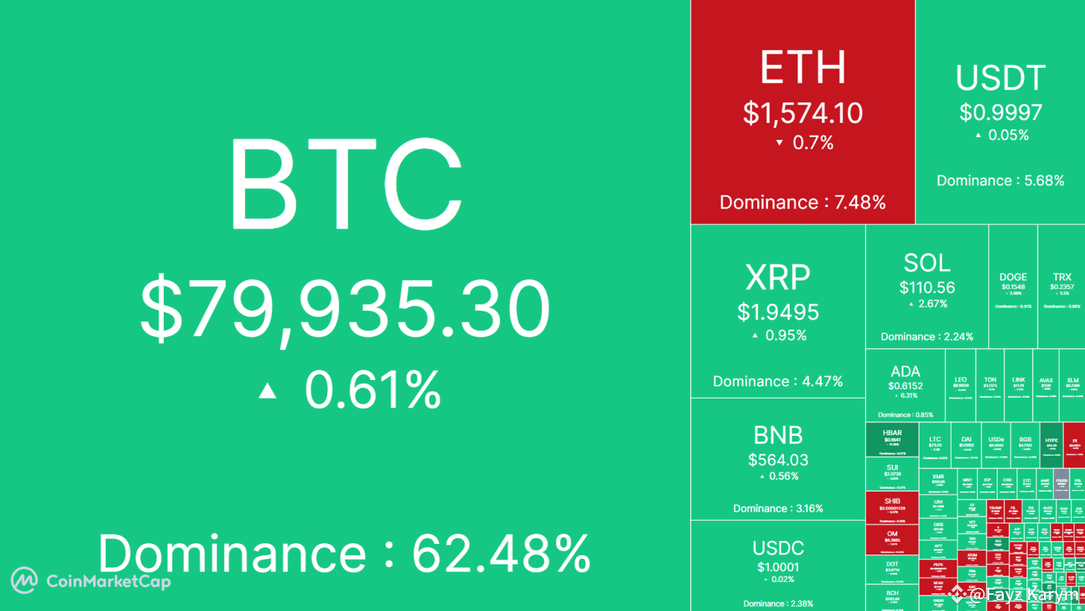 - Bitcoin (BTC) up 0.61% – now at $79,935 (testing $80K resistance)