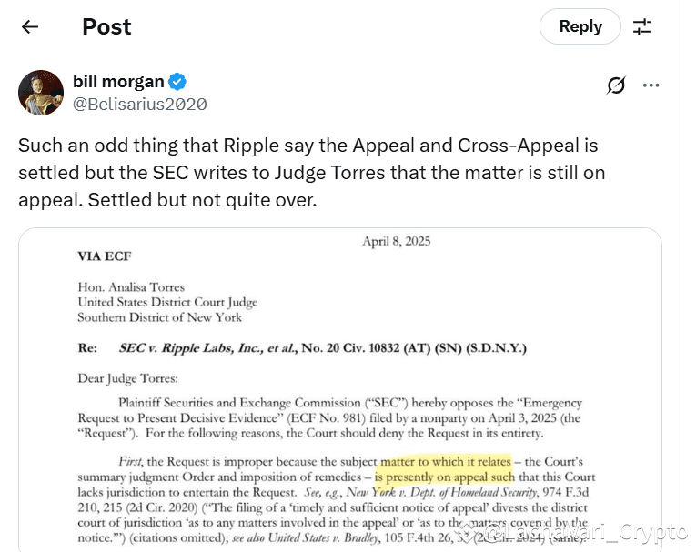 Meanwhile, top legal expert Bill Morgan highlighted a contradiction in how the SEC and Ripple describe the case’s status. Attorney Morgan noted that while Ripple claims the appeal and cross-appeal are over, the SEC has informed Judge Torres that the lawsuit is still under appeal.