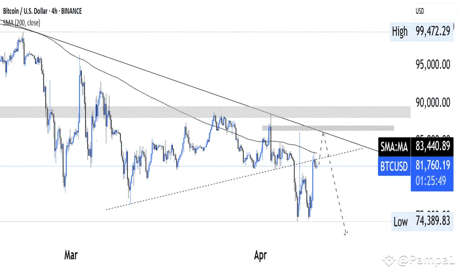 Current Structure: BTC is trading below resistance, forming lower highs—a sign of possible continued weakness.