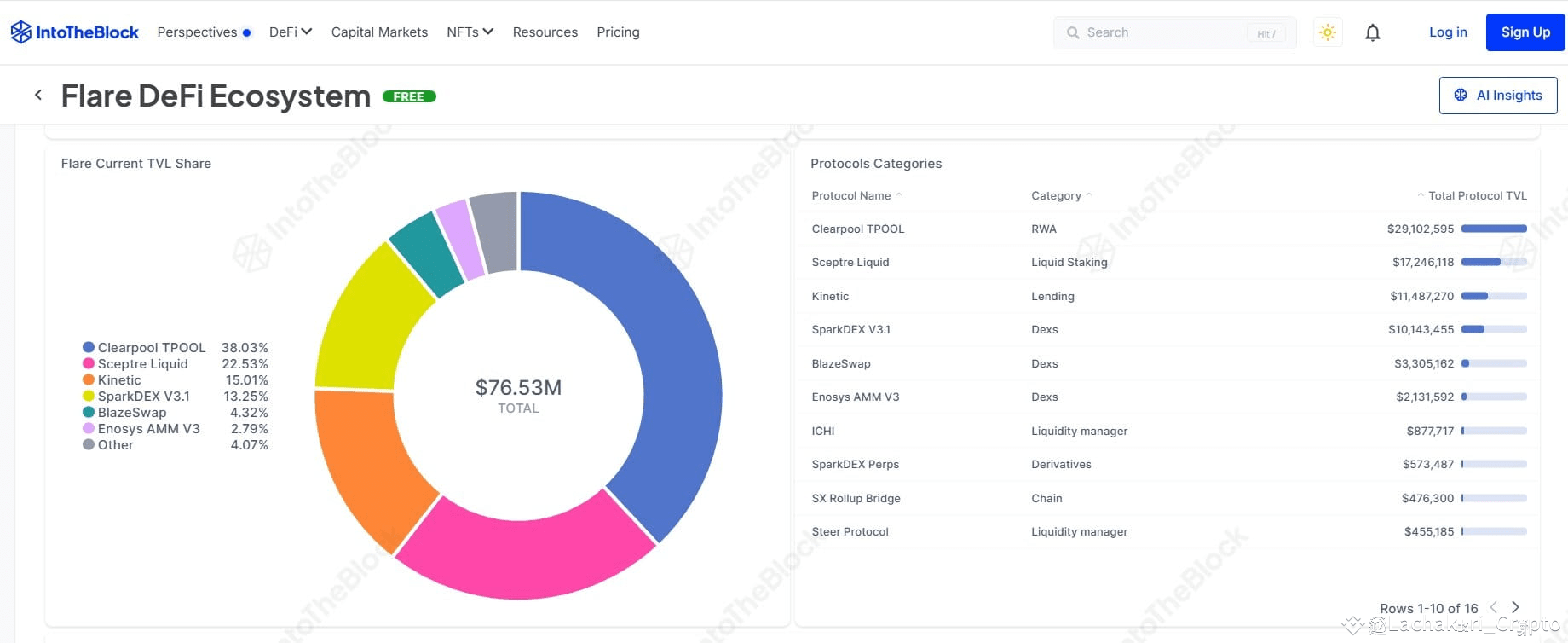 Interestingly, the Clearpool TPOOL has claimed a considerable part of the TVL, accounting for 38.03% of all funds locked in on Flare’s DeFi pool. Currently holding $29.1 million, the TPOOL offers investors borrowing and lending services with real-world assets as collateral.