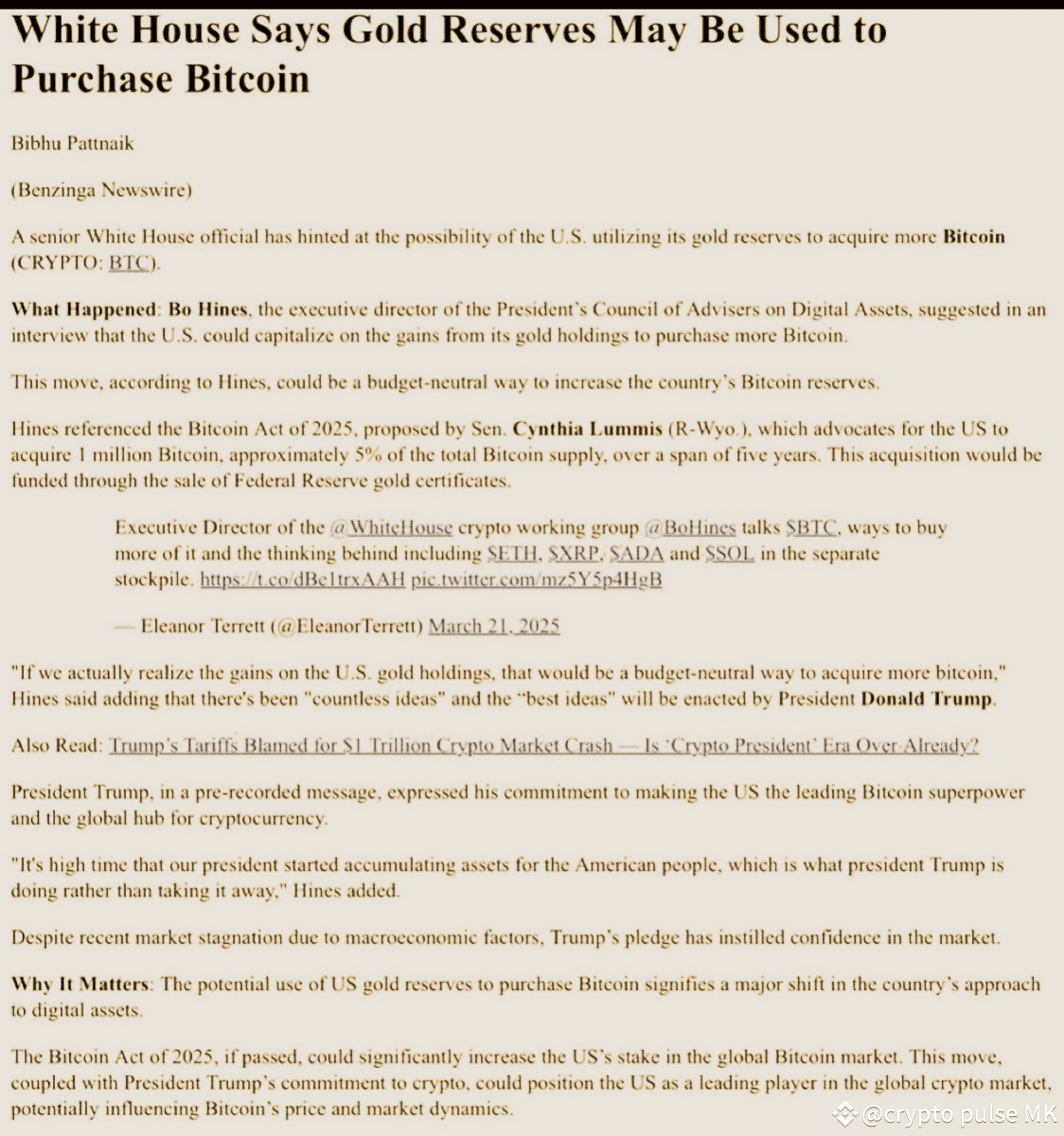 The US White House is considering a bold move to integrate digital assets into the country's reserve strategy. According to Bo Hines, executive director of the President's Council of Advisers on Digital Assets, the government might leverage its gold reserves to acquire Bitcoin. This proposal is part of the Bitcoin Act of 2025, introduced by Senator Cynthia Lummis, which aims to build a strategic Bitcoin reserve of up to 1 million BTC over five years.