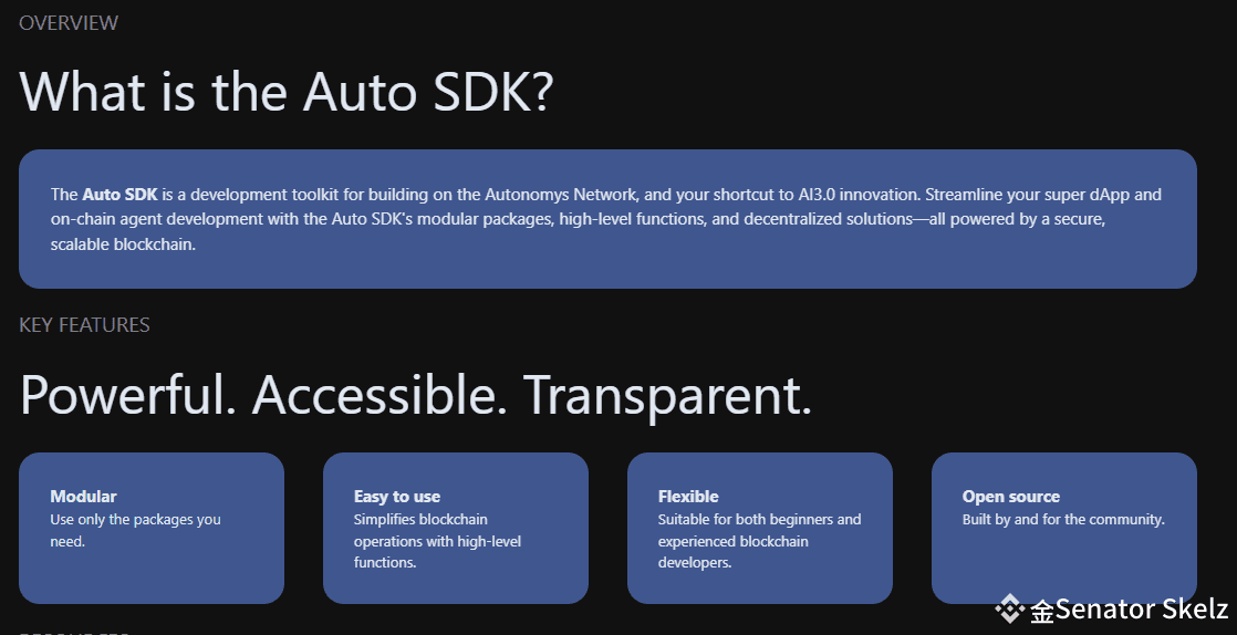 The Auto SDK is a huge part of the Autonomys Developer Hub. It is a comprehensive development toolkit designed specifically for building on the Autonomys Network. Functioning as a "shortcut to AI3.0 innovation," this SDK provides developers with the essential tools to streamline the creation of super dApps and on-chain agents. The platform's architecture integrates permanent distributed storage and compute capabilities, decentralized identity management, and payment handling functionalities—all crucial components for next-generation decentralized applications.