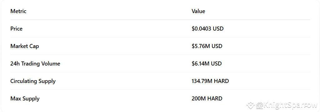 As of today, Kava Lend $HARD is trading at $0.0403, marking a staggering 98.6% drop from its all-time high of $2.96. The token's market capitalization sits at approximately $5.76 million, with a 24-hour trading volume of $6.14 million — much of which still comes from Binance.