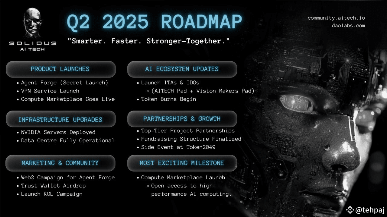 As Solidus @AITECH charges into Q2 2025, its newly released roadmap reflects a bold push into deeper AI integration and Web3 innovation. Building on a successful Q1, the upcoming quarter is packed with high-impact milestones aimed at scaling infrastructure, expanding utility, and fostering elite collaborations.