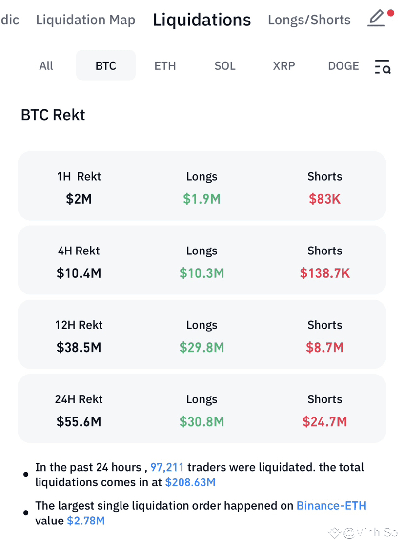 3. Lưu ý: Dữ liệu cho thấy trong 24 giờ qua, tổng thanh khoản bị thanh lý là $208.63M, với lệnh thanh lý lớn nhất trên Binance-ETH ($2.78M). Điều này cho thấy áp lực thanh lý không chỉ tập trung ở BTC mà còn lan sang các altcoin, báo hiệu một giai đoạn biến động mạnh trên toàn thị trường.