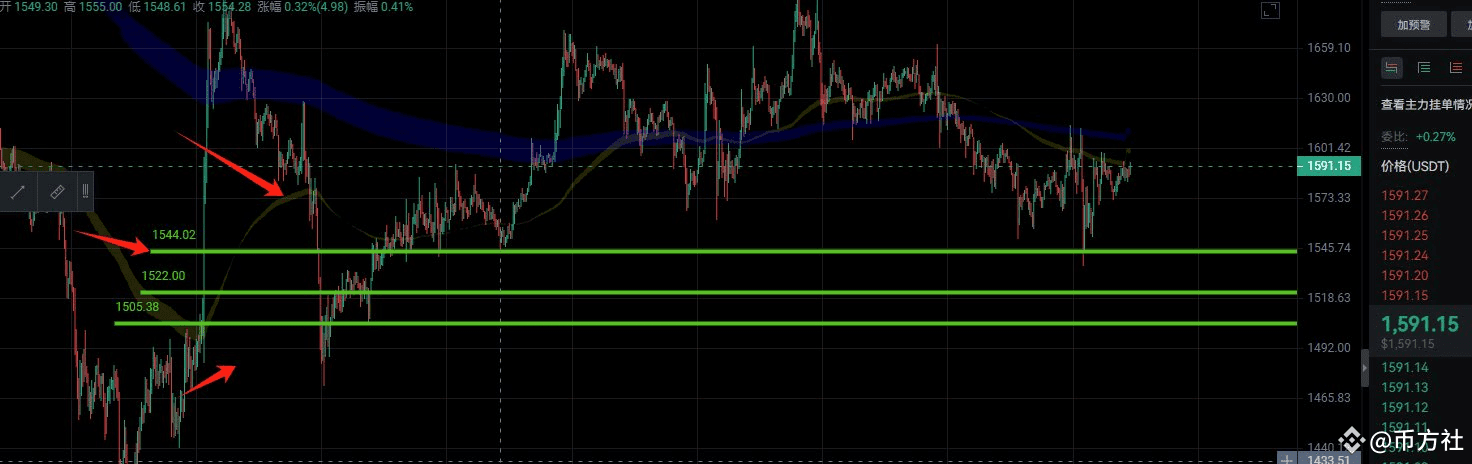 ETH依然是最弱的,重点关注支撑1544、1522做多,止损1505,目标位1590、1610。