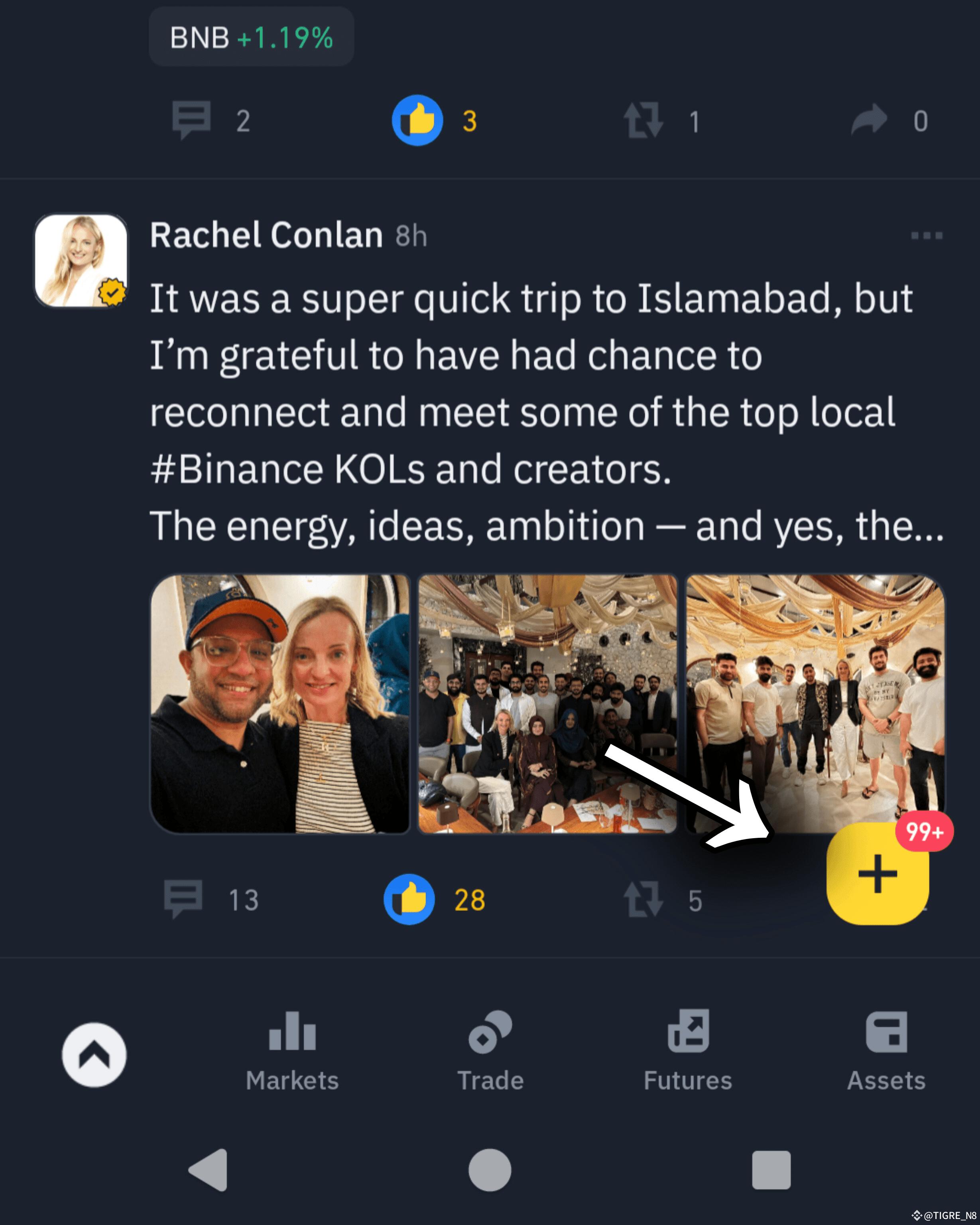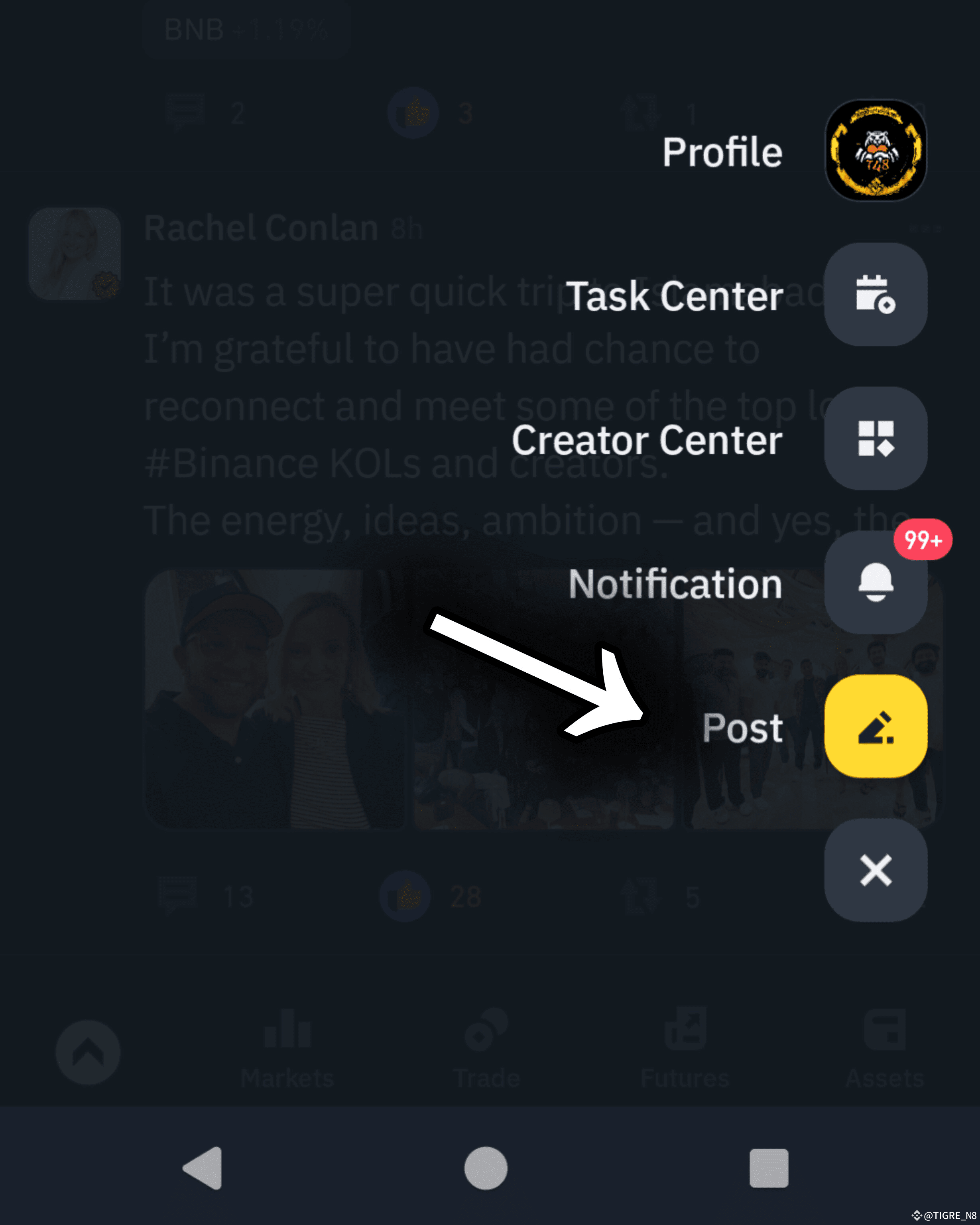 🔸 To start a live audio, scroll down in the main menu until you see the yellow + icon . Then, tap it to see more options.