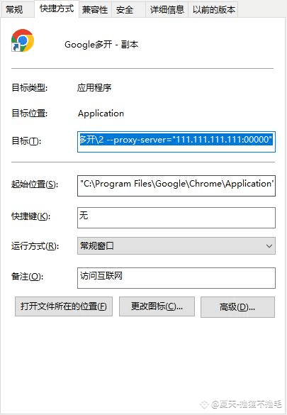 "C:\Program Files\Google\Chrome\Application\chrome.exe" --user-data-dir=D:\google多开\2 --proxy-server="111.111.111.111:0000"