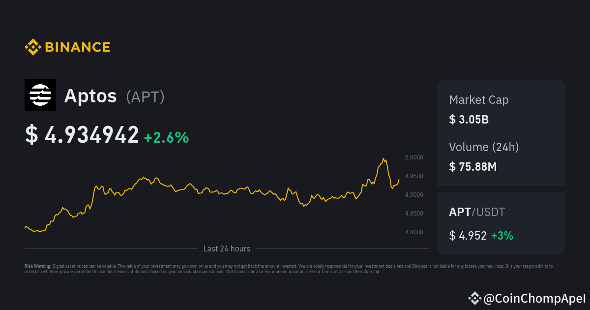 APT is currently priced at $4.93 USD on Binance, up 2.28% in the last 24 hours. The 24-hour range is $4.80 - $4.99 USD.