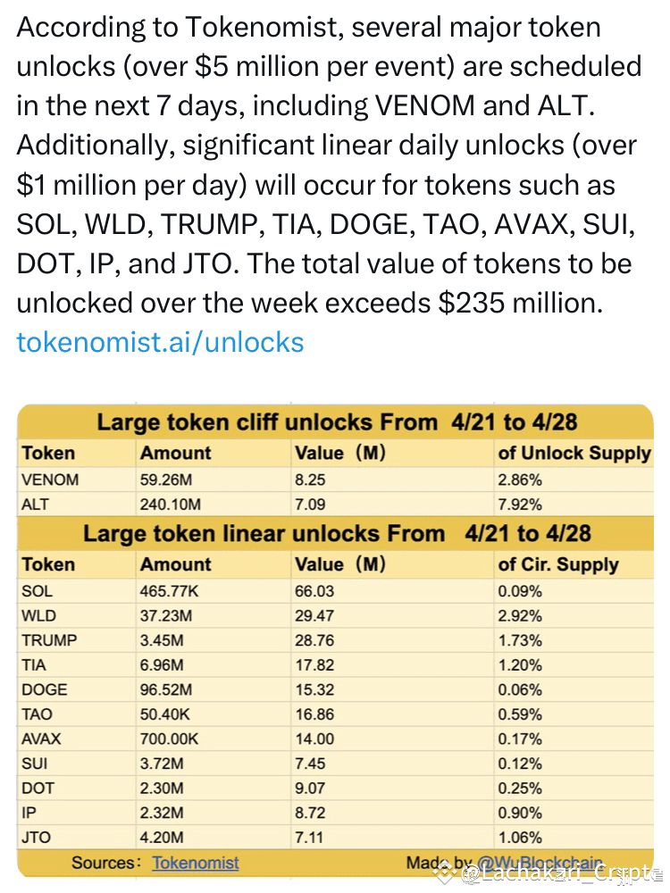 Data from Tokenomist reveals a major Dogecoin token unlock. From April 21 to April 28, approximately 96.52 million DOGE—worth $15.32 million—will be unlocked.
