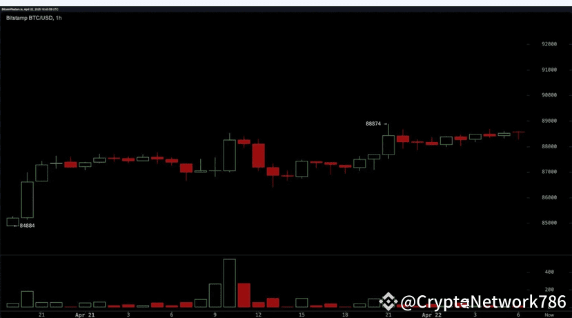 $BTC traded at $88,447 on April 22, 2025, securing a market capitalization of $1.75 trillion. Over the past 24 hours, it moved within a tight range of $86,664.84 to $88,874 on a trading volume of $36.36 billion, reflecting consolidation within a prevailing uptrend.