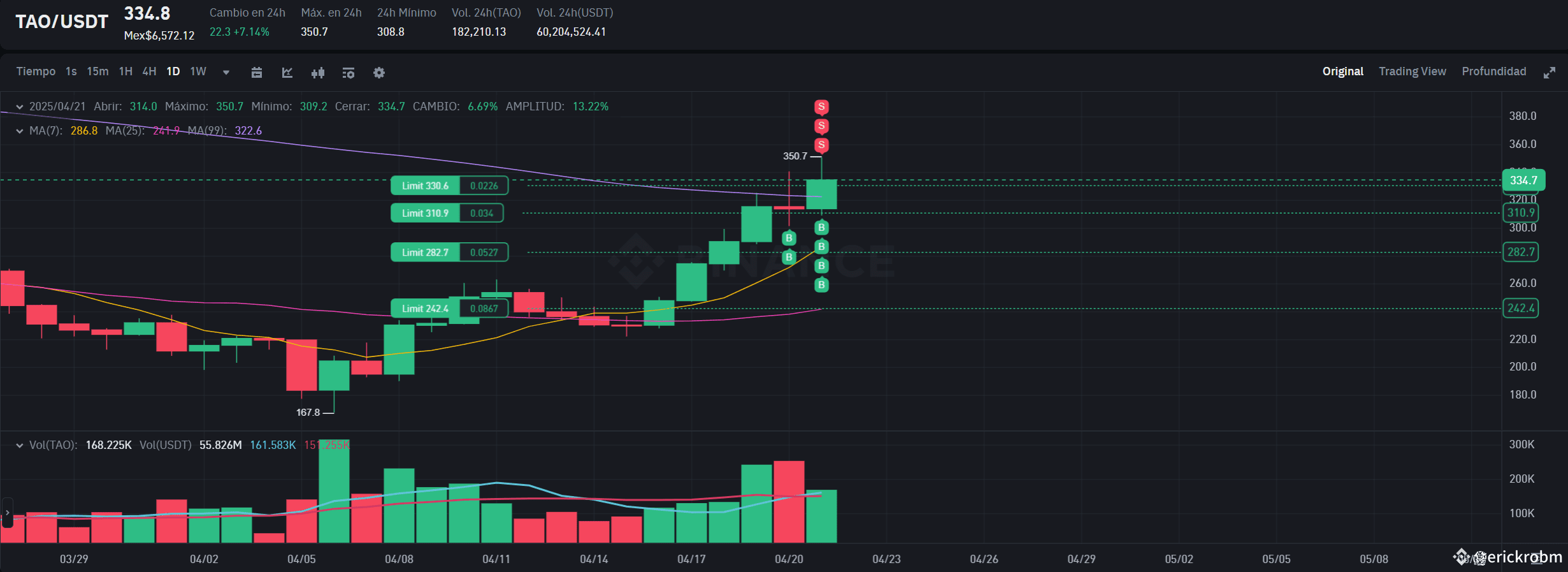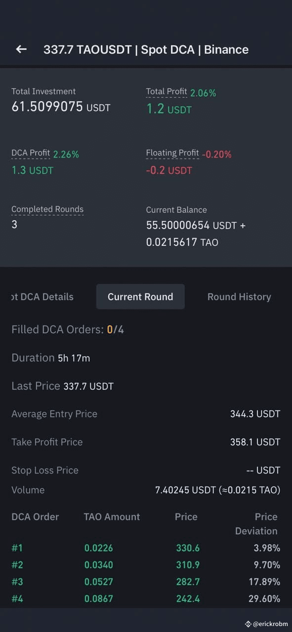 As a result, the only active position remains the $TAO TAO/USDT Spot DCA bot launched yesterday. So far, it has completed three full take-profit cycles, and is now executing the fourth cycle, with no buy orders triggered yet from the newly adjusted price levels.