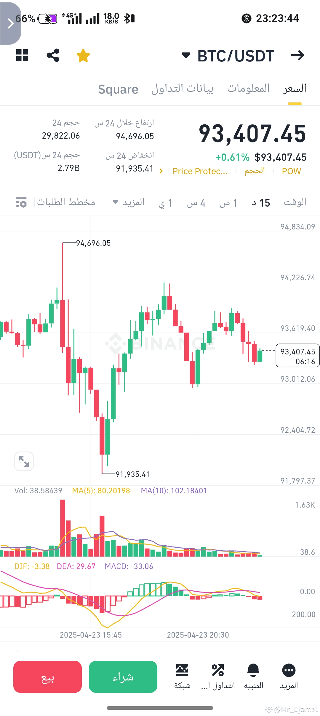 السعر الحالي: السعر عند 93,407.45 وهو أقل من أعلى سعر خلال 24 ساعة (94,696.05)، وأقرب إلى أدنى سعر (91,935.41).
