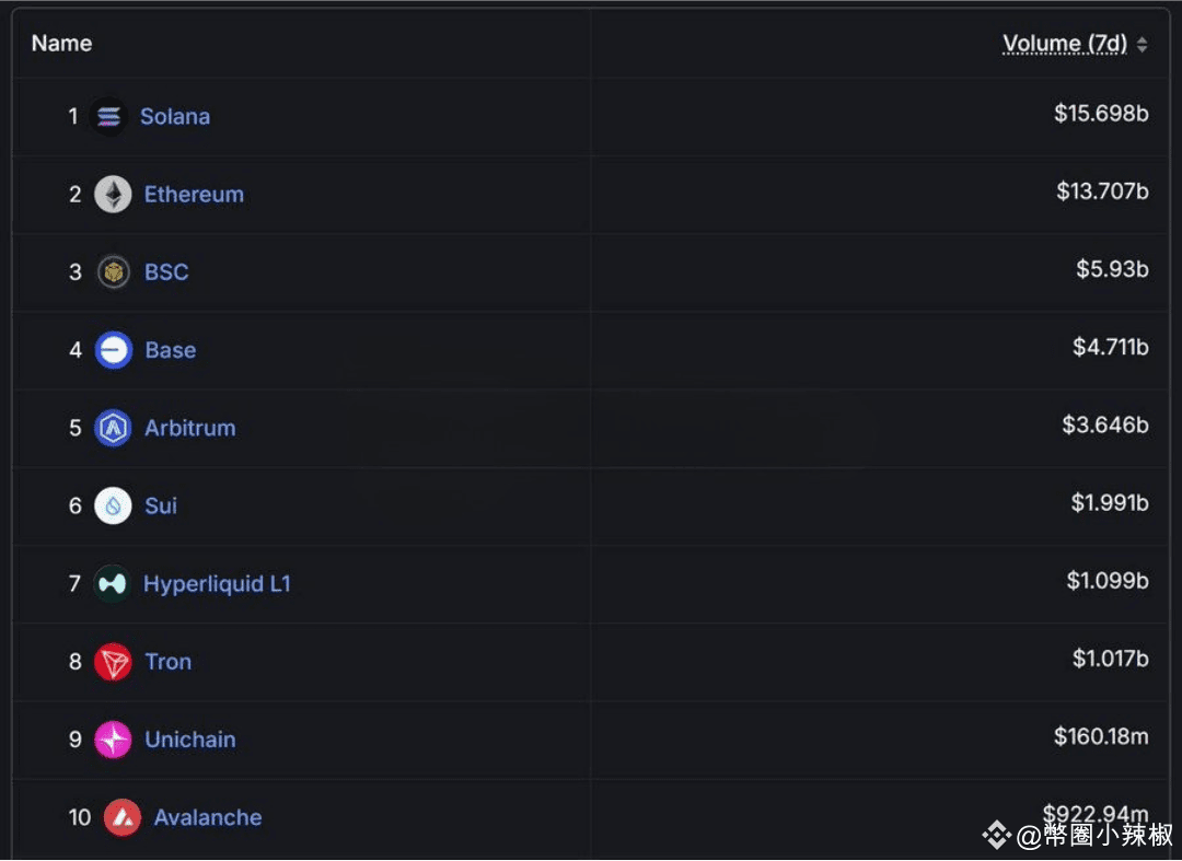 数据亮点: 根据 ChainCatcher 数据,Solana 近 7 日 DEX 总交易量已突破 150 亿美元,不仅遥遥领先于其他 L1/L2 区块链,更标志着 Solana 的链上流动性正在发生质变。