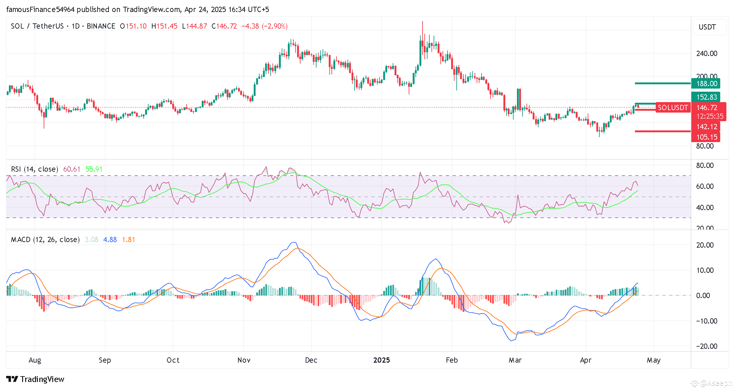 - Bullish Case: If SOL holds above 142.12 and breaks 151.10, the next targets are 155.00 and 160.00. The MACD and RSI support this scenario.