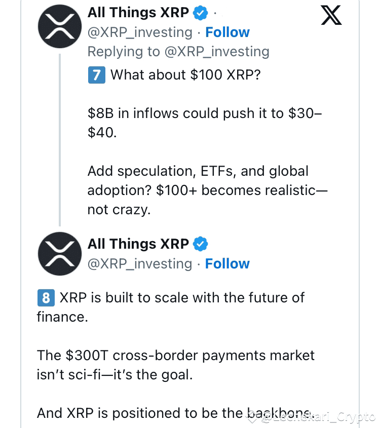 “All Things XRP” suggested that even an $8 billion capital inflow could push XRP’s price into the $30–$40 range. With additional catalysts such as speculative rallies, ETF approvals, and institutional interest, the $100 mark may not be as far-fetched as critics claim.