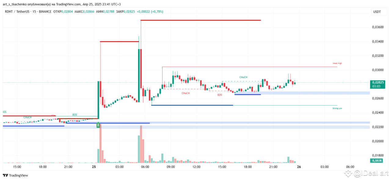 - 24ч: 1.30B RDNT ($37.14M USDT) — высокая ликвидность.