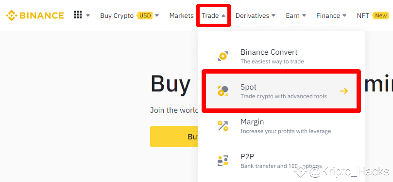 El trading en spot en Binance es un proceso simple una vez que te has registrado para obtener una cuenta. Revisemos la vista de exchange de Binance y exploremos cómo realizar un trade en spot. Puedes encontrar la plataforma de trading en spot ubicando el cursor sobre [Trade] y haciendo clic en [Spot] en la página de inicio de Binance.