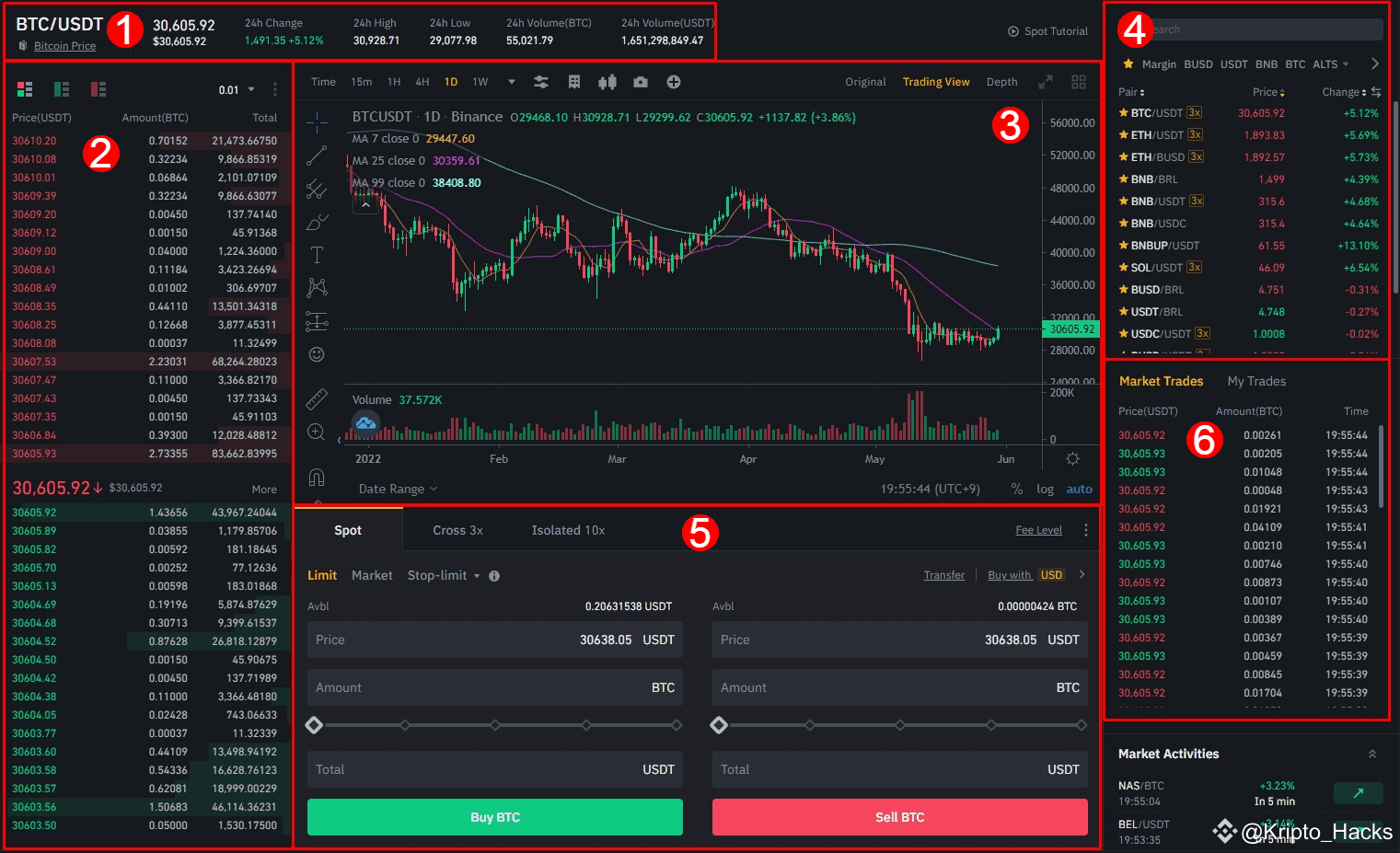4. En la esquina superior derecha, puedes buscar distintos pares de trading. Aquí, puedes elegir el par de criptomonedas con el que deseas hacer trading en el mercado spot, así como marcar tus pares favoritos haciendo clic en las estrellas pequeñas. Ten en cuenta que no solo puedes comprar criptomonedas con fiat. Si tienes otras criptomonedas, también puedes intercambiarlas por otras monedas y tokens en el mercado spot.