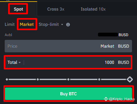 Echemos un vistazo al trade en spot más sencillo que puedes realizar: una orden market. En nuestro ejemplo, deseas comprar 1,000 USD (BUSD) en Bitcoin (BTC). Para hacer esto, todo lo que debes hacer es ingresar 1,000 en el campo [Total] y hacer clic en [Comprar BTC]. El exchange entregará el BUSD inmediatamente al vendedor, y tú recibirás 1,000 BUSD en BTC.