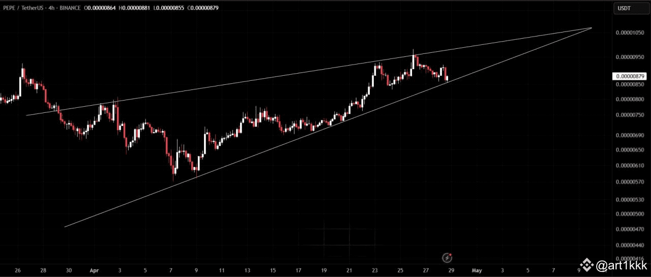 PEPE is trading within a rising wedge pattern and is currently rebounding from the support trendline. The price is regaining momentum after a period of weakness. If PEPE maintains its current level, it could retest the resistance trendline or even break out of the pattern. However, if a breakdown occurs, the price may decline further.