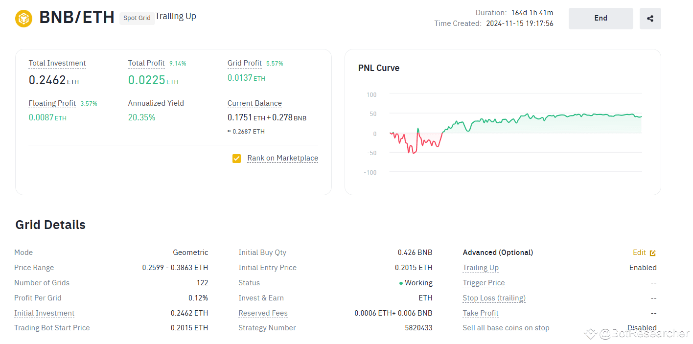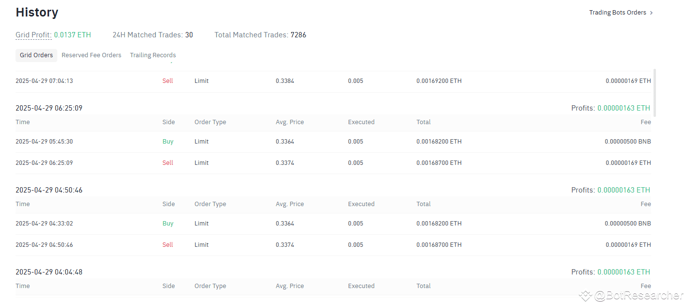 Continuing the topic of grid bot research, I want to show one of my good results. As it has already become clear, these bots on a bullish trend are practically meaningless. They behave better when there are fluctuations; besides, I had $ETH in storage. And I decided to create a grid bot ETH$BNB. And this bot is still alive and still brings profit. It's like two titans fighting, and you're profiting from it. The screenshot shows its indicators. In my opinion, they are not bad, especially considering that I can use a bonus $USDC on commissions for this bot, which can be earned, for example, by solving a crossword puzzle#WotdChallenge ! Let's calculate, the average commission for buying and selling is 0.000005 BNB and 0.00000169 ETH, if we translate this into $USDT and multiply by the number of successful transactions, we get approximately 44 USDT, which means that the real profit from this bot can be obtained in the amount of 44 percent, due to the reimbursement of commissions!