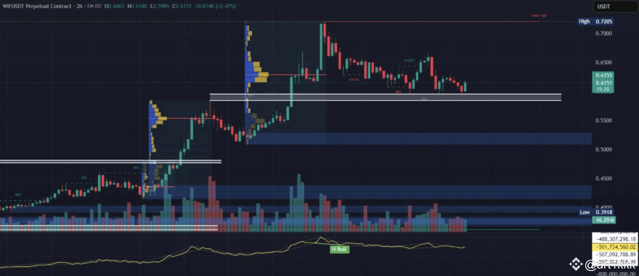 Since mid-April, WIF has escaped a deep base at 0.39–0.42 USDT, where large seller orders accumulated. A push through 0.52–0.54 USDT produced a clear Break of Structure (BOS), followed by a retest at 0.60 USDT that flipped this level into robust support. The bullish impulse gained strength with a Change of Character (CHoCH) above 0.62 USDT, driving price to a weak high of 0.72 USDT. Now WIF is retracing into the 0.58–0.60 USDT zone, where bulls defend their longs and bears probe the support.