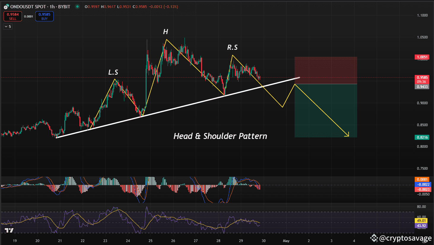 Ondo appears to be forming a Head & Shoulders pattern on the 1-hour timeframe, which is typically a bearish signal. Currently, the price action is respecting an upward trendline that has been acting as dynamic support. A potential short setup could emerge if Ondo breaks below this trendline and confirms the move with a successful retest. That would be an ideal point to consider entering a short position.